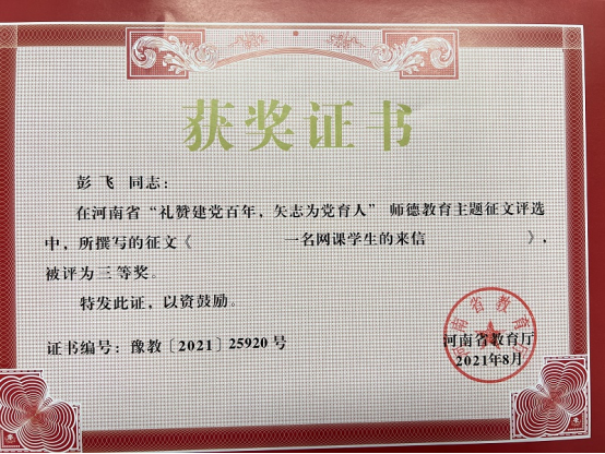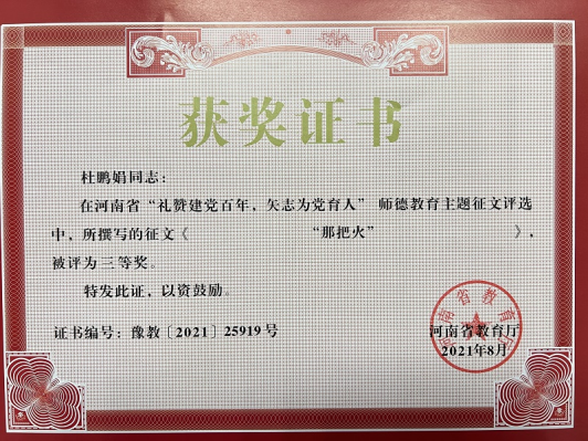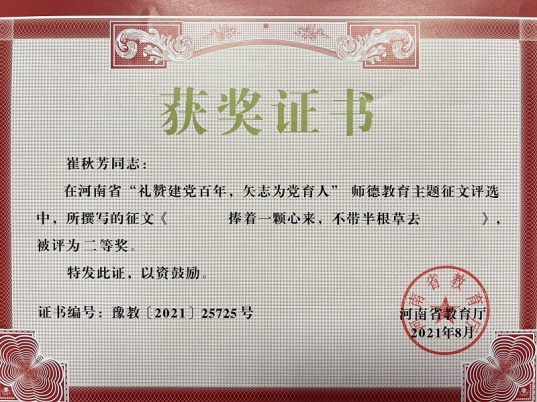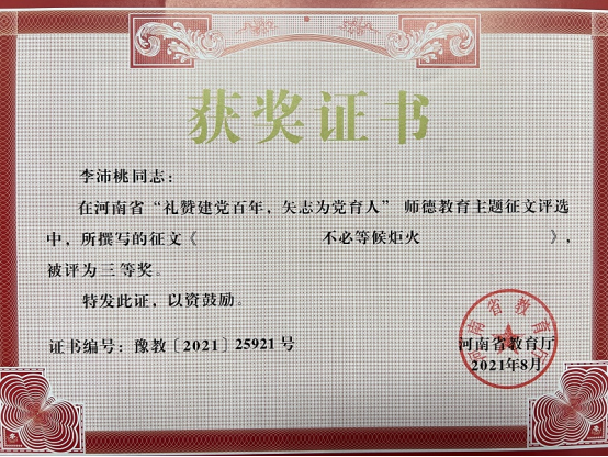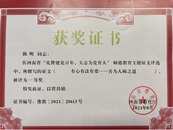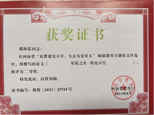 近日,从《河南省教育厅关于公布“礼赞建党百年,矢志为党育人”诗歌朗诵比赛、师德教育主题征文和师德师风优秀案例评选结果的通知》(教师〔2021〕289号)中获悉,我校6位教师榜上有名,在征文类活动中荣获多项奖项。