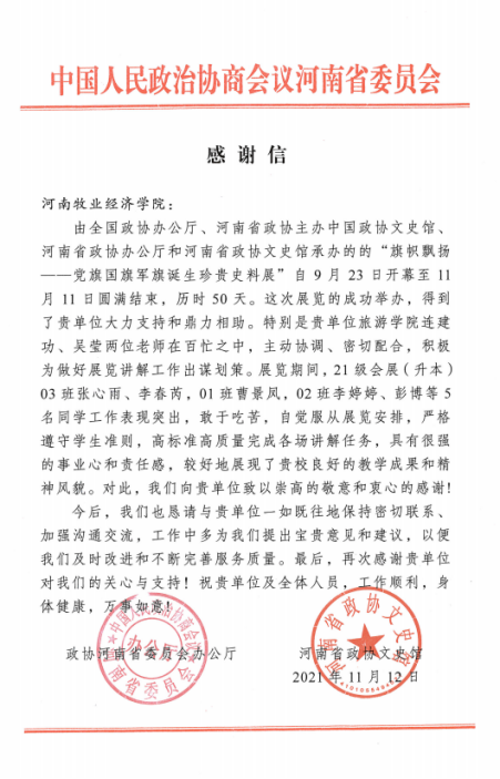 近日,政协河南省委员会办公厅、河南省政协文史馆向我校发来感谢信,对我校旅游学院师生在“旗帜飘扬——党旗国旗军旗诞生珍贵史料展”中所作的高标准高质量工作表示感谢。