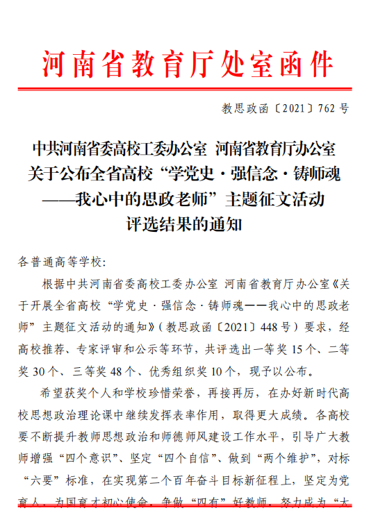 近日,中共河南省委高校工委办公室河南省教育厅办公室发布《关于公布全省高校“学党史·强信念·铸师魂——我心中的思政老师”主题征文活动评选结果的通知》(教思政函〔2021〕762号),我校经济与贸易学院教师苗欣荣获征文一等奖。