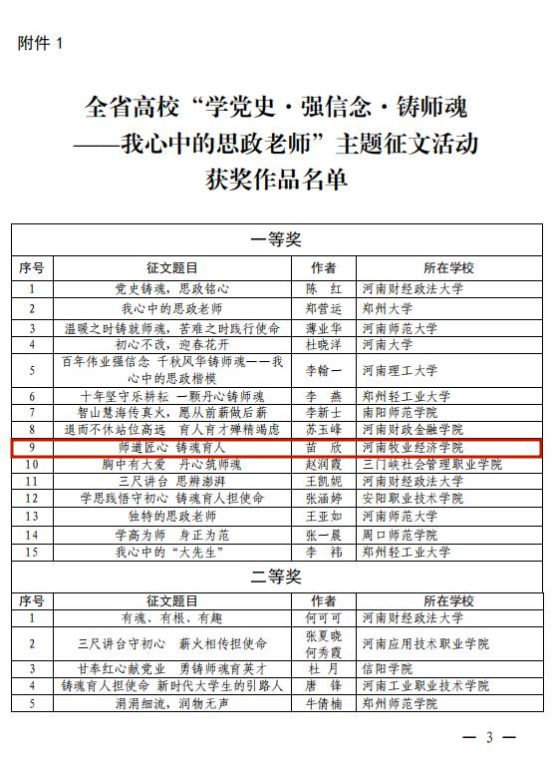 “学党史·强信念·铸师魂——我心中的思政老师”主题征文活动旨在引导广大教师坚定理想信念、厚植爱国情怀、涵养高尚师德,坚定为党育人、为国育才的使命担当。经过我校评选、推荐,省委高校工委组织专家评审、公示等环节,我校教师苗欣博士脱颖而出,征文作品《师道匠心铸魂育人》被评选为一等奖,全省高校共有15人获得同等奖项。