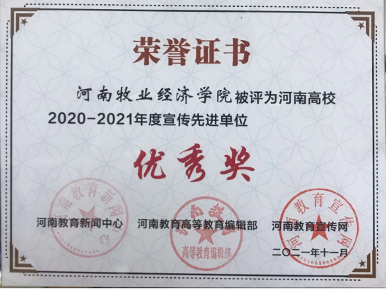 此项荣誉的获得,是河南省教育新闻中心对我校宣传工作的肯定,更是我校宣传思想工作者在校党委的坚强领导下,共同努力的结果。校党委宣传部将认真学习贯彻党的十九届六中全会精神和省第十一次党代会精神,进一步做好学校宣传思想工作,不断总结经验,持续提升工作能力和工作水平,开创宣传思想工作新局面。(李特 文/图)