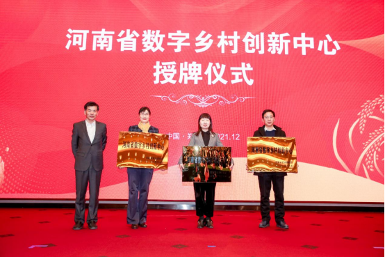 河南省农业农村厅党组成员、省农机中心主任凌中南为三家河南省数字乡村创新中心授牌。