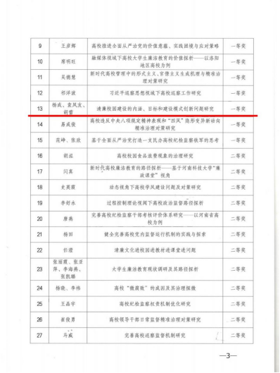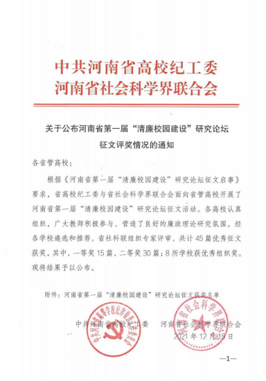 近日,中共河南省高校纪工委、河南省社会科学界联合会发布《关于公布河南省第一届“清廉校园建设”研究论坛征文评奖情况的通知》,我校纪委杨成、袁凤友、胡蕾提交的论文《清廉校园建设的内涵、目标和建设模式创新问题研究》获得一等奖。校纪委杨成等将于12月23日受邀参加在郑州航空工业管理学院举办的研究论坛开幕式。