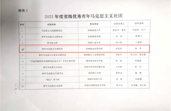 近日,中共河南省委宣传部、中共河南省委高校工委、河南省教育厅、共青团河南省委联合下发《关于公布2021年度省级示范性青年马克思主义社团和省级优秀青年马克思主义社团评选结果的通知》,我校青年马克思主义研学社荣获“2021年度省级优秀青年马克思社团”。校团委书记杨莉被评为2021年度省级青年马克思主义社团优秀指导教师。