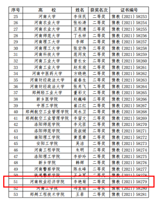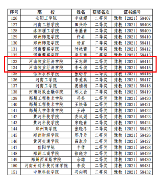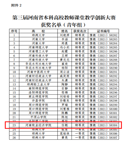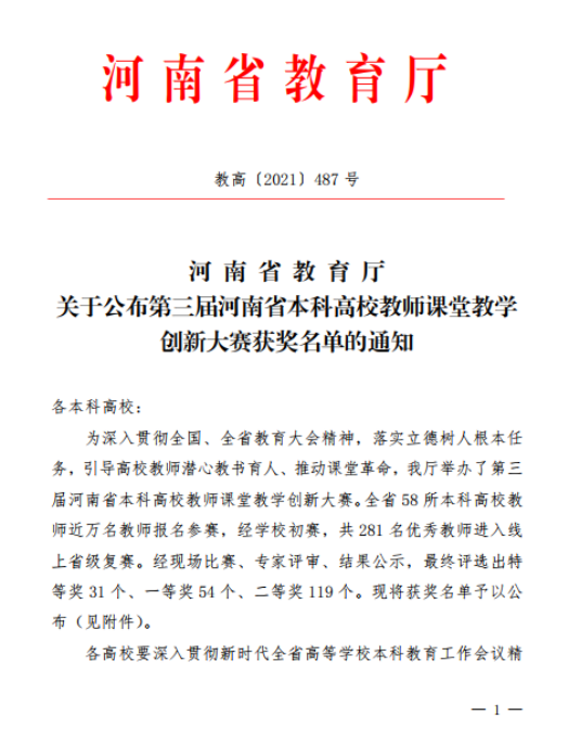 近日,河南省教育厅发布《关于公布第三届河南省本科高校教师课堂教学创新大赛获奖名单的通知》(教高〔2021〕487号),我校理学部任聪老师获得青年组特等奖,食品与生物工程学院李长滨老师获得青年组二等奖,物流与电商学院李艳菊老师获得教授组二等奖、王志辉老师获得青年组二等奖。