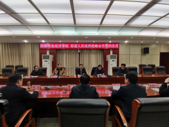 12月28日,校长罗士喜,副校长杨宝进等一行5人赴郏县,同郏县人民政府签订战略合作框架协议。郏县县长李红民,县委常委、组织部部长宋罡,副县长李政杰,我校社会服务办公室、动物科技学院等相关负责人,郏县红牛产业发展服务中心,平顶山瑞宝红牛肉业有限公司、平顶山润浦牧业有限公司负责人参加了签约仪式。签约仪式由县政协副主席、副书记周慧敏主持。