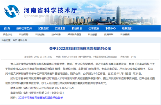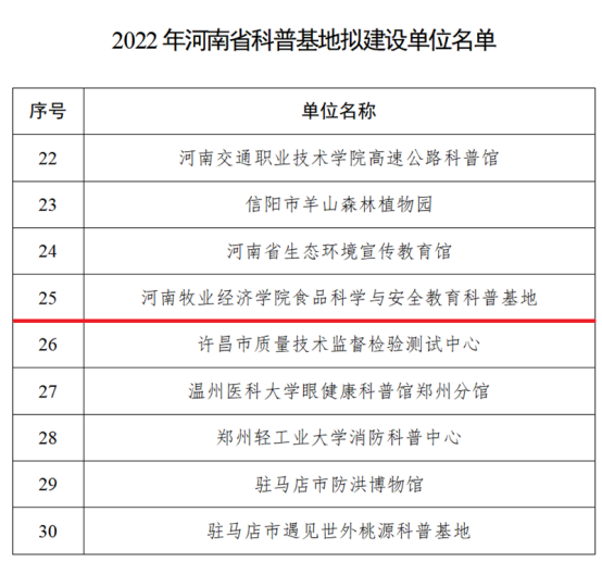 近日,河南省科学技术厅公布了2022年拟建河南省科普基地名单,我校“食品科学与安全科普教育基地”成功入选。