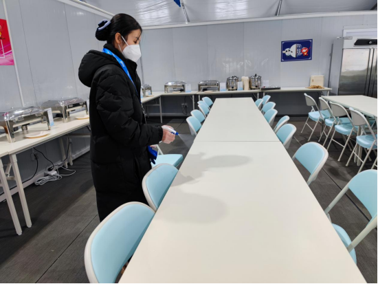 正式党员、2020级会展经济与管理专业学生王婷,工作点位在国家冬季两项中心国内技术官员休息室。她每天帮助客人打餐、巡视餐线、进行食物补给......使国内技术官员能够不间断的享用美食。