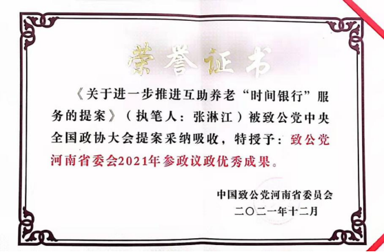 2021年3月,中国致公党河南省委员会发来函件,通报了张淋江老师撰写的《关于进一步推进互助养老“时间银行”服务的提案》被致公党中央采用,作为提案素材吸收入全国政协十三届四次会议集体提案。近期被授予“2021年参政议政优秀成果”,是致公党省委对张淋江老师参政议政工作积极性的肯定。