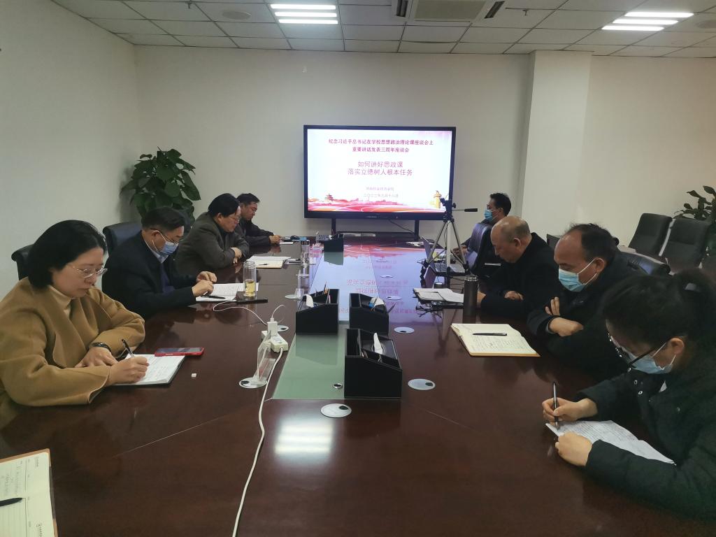 2022年3月18日,我校围绕“如何讲好思政课 落实立德树人根本任务”的主题,以视频会议的形式召开纪念习近平总书记学校思想政治课教师座谈会重要讲话发表三周年座谈会。校长罗士喜、党委副书记李俊杰出席,党委宣传部部长吴静、教务处处长边传周等部门负责人,马克思主义学院全体教师参加座谈。座谈会由李俊杰主持。