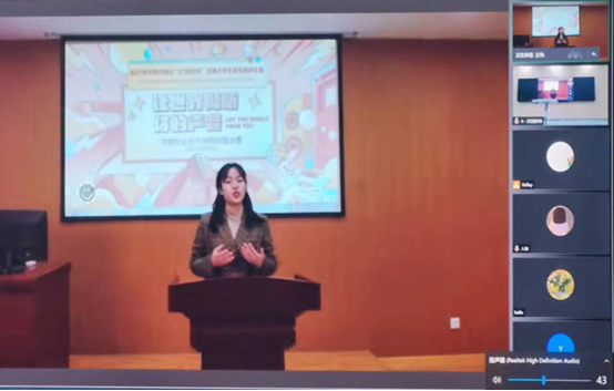 此次此次英语演讲比赛以线上线下相结合的方式进行,通过腾讯会议进行直播。比赛为广大学子搭建了用英语展现自我、传播中国声音的舞台,不仅充分展示了我校学生的英语风采和英语素养,也检验了我校外语教学的成果,浓厚了校园的英语学习氛围,对持续提升学生的英语应用能力、助推我校开放型和国际化办学进程必将起到积极的促进作用。(田春霞 文/图)