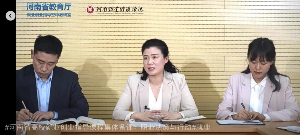 近日,由河南省教育厅主办、河南省大中专学生就业服务中心承办的“空中教研室 聚力共成长——河南省高校就业创业指导课程集体备课”活动陆续开播。我校受省教育厅邀请作为线上展示高校,开展了“职业决策与行动”主题集体备课研讨会,并于4月22日晚7:30,在“河南大学生职业能力发展平台”微信公众号进行了首播。