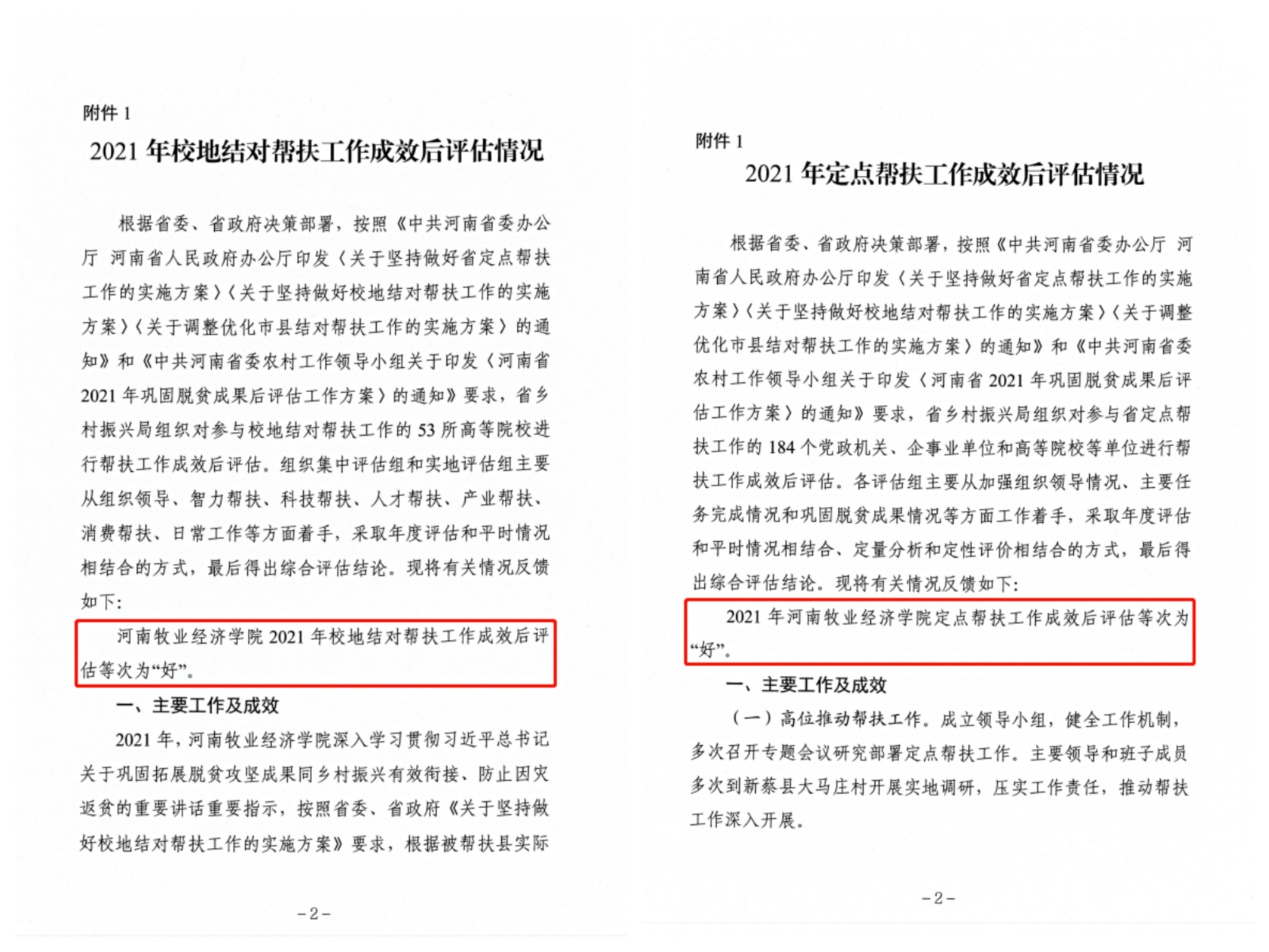 近日,河南省乡村振兴局发文反馈2021年巩固脱贫攻坚成果后评估情况,我校校地结对帮扶和定点帮扶两项工作均获最高等次——“好”。
