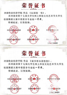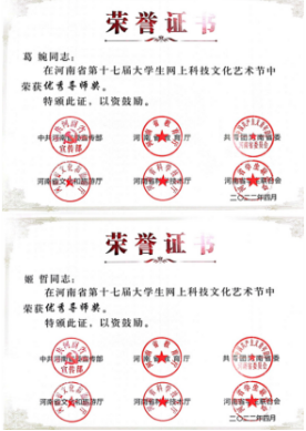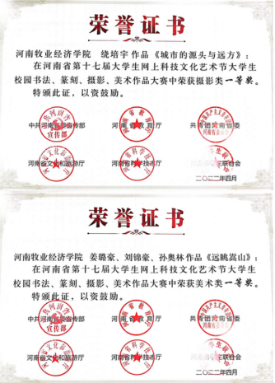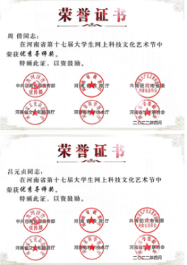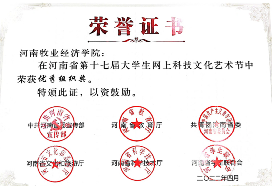 近日,中共河南省委宣传部、省教育厅、团省委、省文化厅、省学联联合下发了《关于发布河南省第十七届大学生网上科技文化艺术节获奖作品(个人)和优秀组织单位名单的通知》(豫青联字〔2022〕9 号),对河南省第十七届大学生科技文化艺术节各项赛事进行了表彰,我校喜获优秀组织奖和31项荣誉。其中一等奖4项,二等奖8项,三等奖13项,周倩、邢珊珊、葛婉、吕元贞、姬哲五位老师荣获优秀导师奖,获奖数量名列全省高校前茅。
