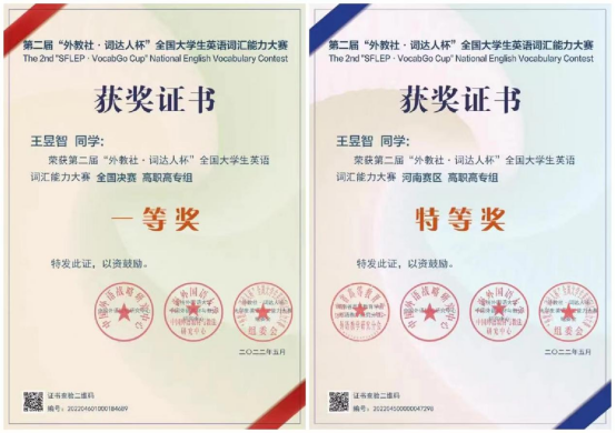 近日,第二届“外教社杯·词达人”全国大学生英语词汇能力大赛落下帷幕,我校2021级大数据技术专业学生王昱智以优异的成绩获得国赛一等奖,成为河南省在全国决赛中获奖的两名选手之一;我校2018级商务英语专业的陈深等4名学生获得省赛本科英语专业组/非英语专业组二等奖;2021级国际商务专业的韦祎睿紫等8名学生获得省赛本科非英语专业组三等奖。