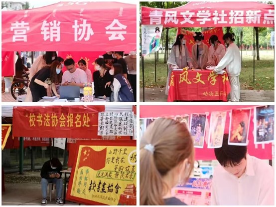 各社团为了招贤纳新纷纷开展特色活动,用丰富多彩的表演展现青春风采。烘焙协会、侍酒协会用美食美酒吸引同学们的驻足围观;武术协会以特色功夫表演赢得阵阵欢呼;爱乐协会用乐器传出欢快的律动;环保志愿者协会发挥专业特色,用创艺纸艺设计祝福祖国母亲生日快乐,激发同学们兴趣;清源读者协会、牧野文社、马克思主义读书会等社团通过宣传彩页、展板海报等各种形式,介绍社团特色。