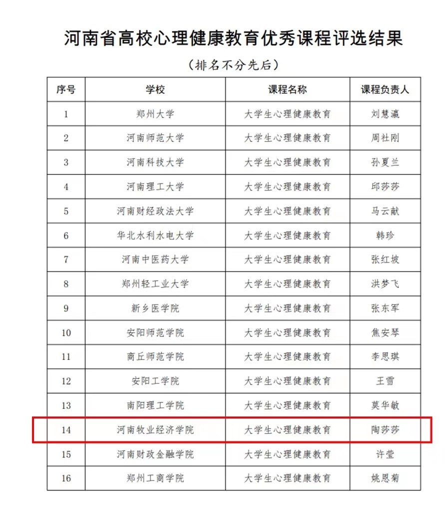 近日,河南省教育厅公布了全省高校心理健康教育优秀课程评选结果(豫教工委〔2022〕116号),我校《大学生心理健康教育》课程荣膺该荣誉。