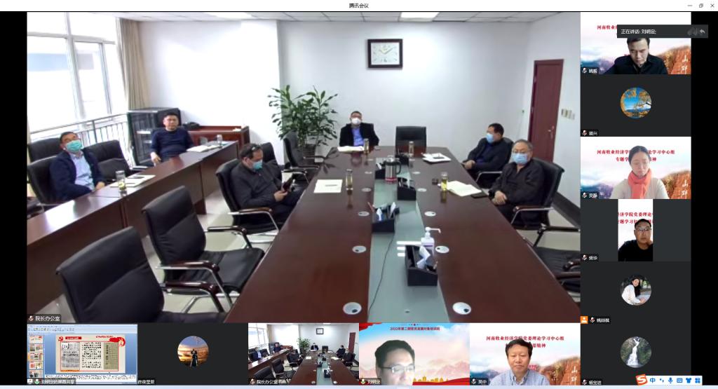 12月13日上午,学校通过线上线下相结合的方式,召开党委理论学习中心组红旗渠精神专题学习会,邀请马克思主义学院刘明定博士作专题报告。驻校党委理论学习中心组成员在龙子湖校区810参加会议,其他成员以腾讯会议形式参加会议。会议由校党委副书记李俊杰主持。