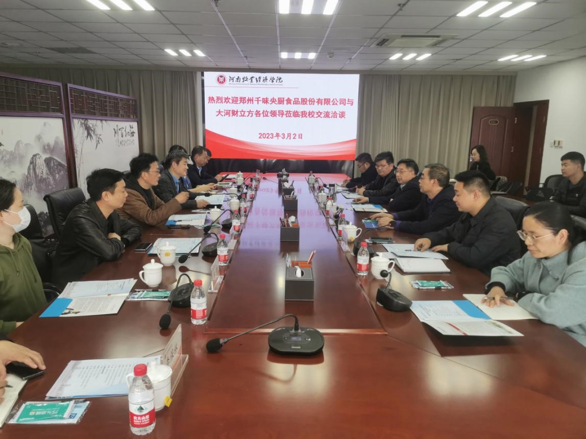 3月2日,郑州千味央厨食品股份有限公司和大河财立方的孙剑、王鲁峰等一行8人赴我校洽谈预制菜合作高质量发展、产学研一体化提质增效等工作。校长罗士喜出席座谈交流会。会议由食品与生物工程学院(酒业学院)院长邹建主持。