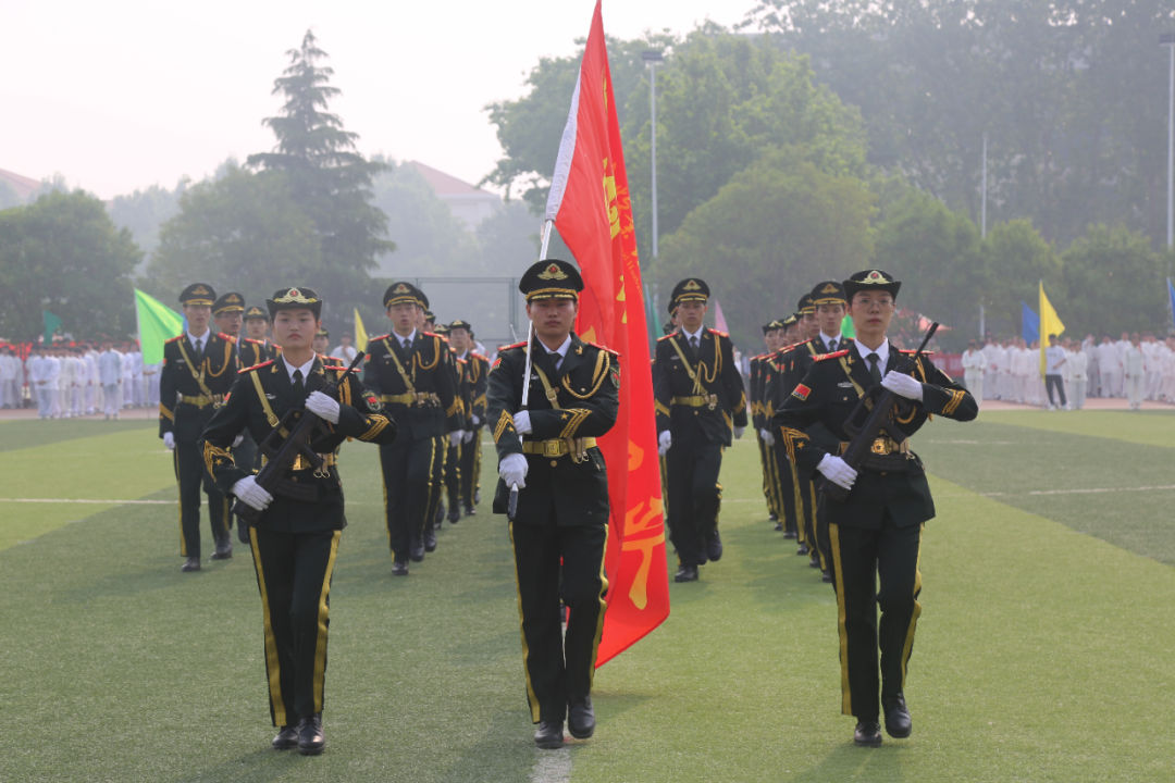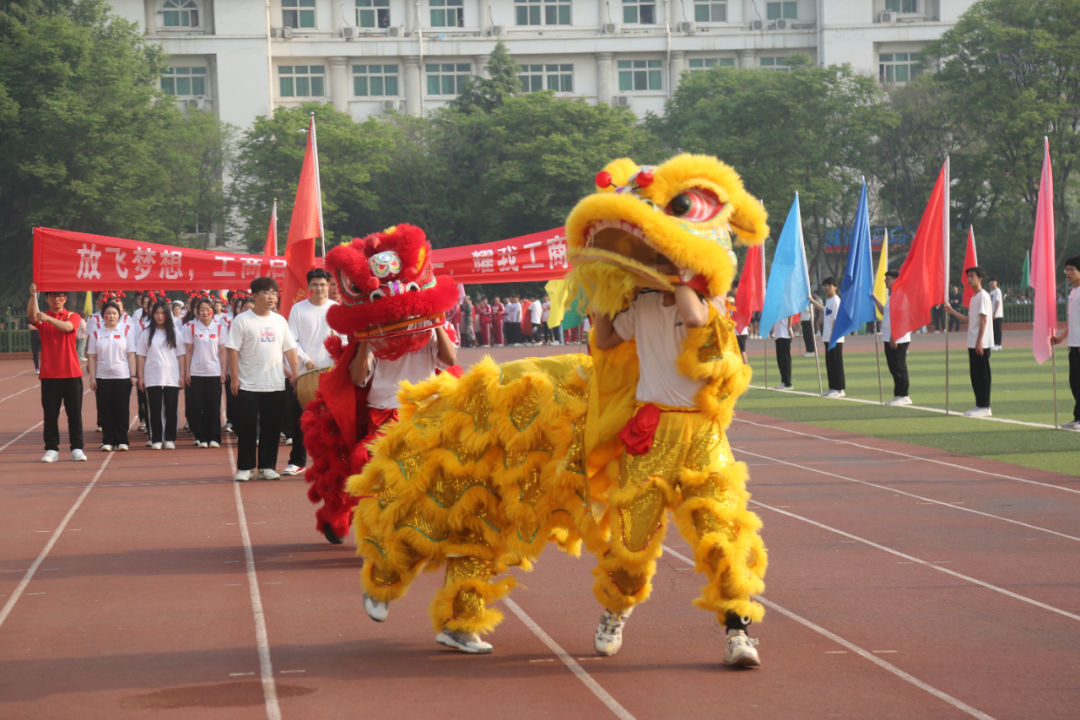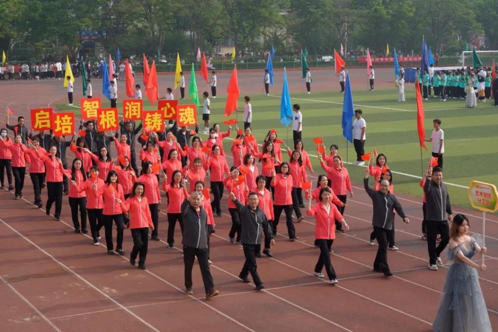 沐浴朝阳,鲜艳的五星红旗冉冉升起。田径场上,彩旗飘扬,人声鼎沸,气势如虹。在激昂的运动员进行曲中,国旗队、校旗队、彩旗队、裁判员代表队、14个学院学生运动员代表方队和28个教工分工会代表方队气宇轩昂踏入赛场。本届运动会召开时值全面学习贯彻党的二十大精神和习近平新时代中国特色社会主义思想之际,“学习党的二十大,奋进新征程”、“启智润心,凝心铸魂”的标语牌、展翅高飞的和平鸽、科技动感的机器人、梦幻炫酷的彩色烟雾、栩栩如生的金狮跃动……方队入场展示别出心裁,独树一帜,百花齐放,精彩纷呈,既彰显专业特色,又弘扬了中国传统文化,更展现了学校师生听党话、感党恩、跟党走的信心与决心。