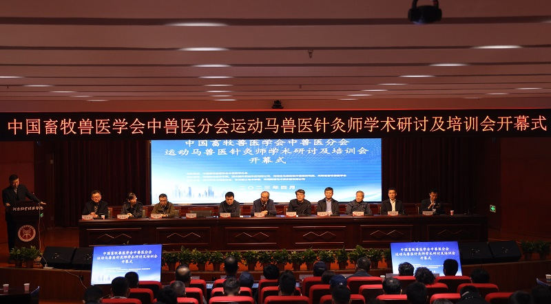 近日,由我校承办的中国畜牧兽医学会中兽医学分会“运动马兽医针灸师学术研讨及培训会”开幕式在我校图书馆一楼学术报告厅顺利举办。中兽医学会理事长穆祥教授、河南省畜牧兽医学会秘书长王彦华、我校副校长杨国宇教授等20位专家学者应邀出席开幕式,来自全国各地的高校师生、企业代表、行业精英100余人参与大会,大会由中兽医学会秘书长、中国农业大学范开教授主持。