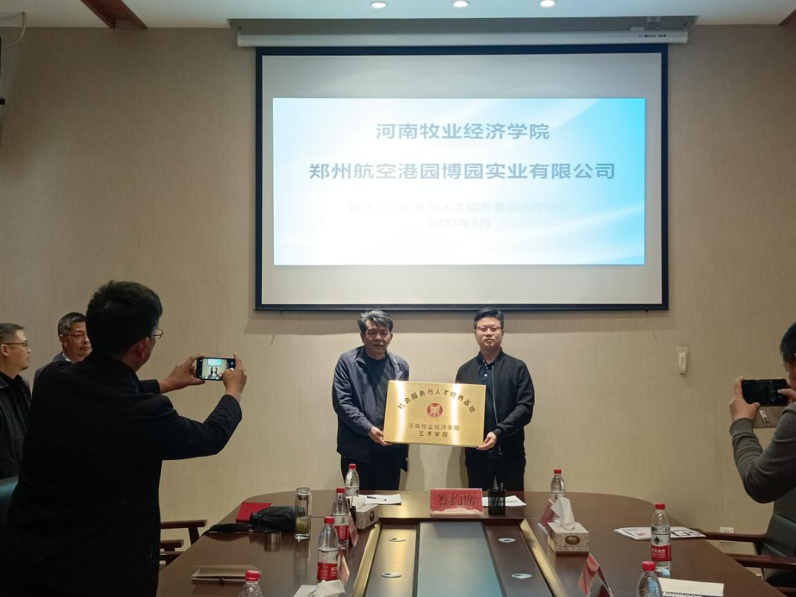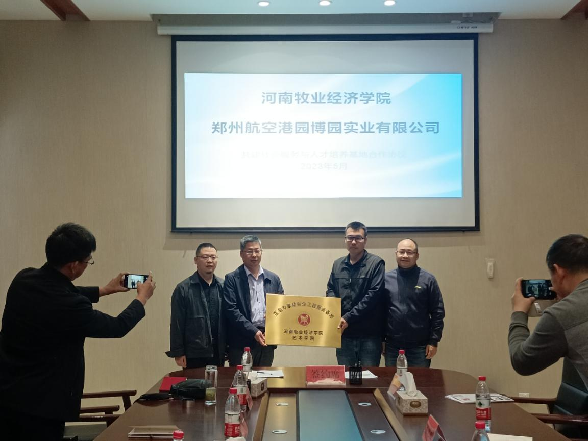 为持续推进“百名专家助百村(企)”工程(“双百”工程)实施,服务河南省园林业高质量发展,推动社会服务提质增效,5月6日上午,副校长杨国宇带领社会服务办公室主任胡华锋,艺术学院党委书记王国辉、院长张鹏等相关领导赴郑州航空港园博园实业有限公司举行校企合作签约暨授牌仪式。