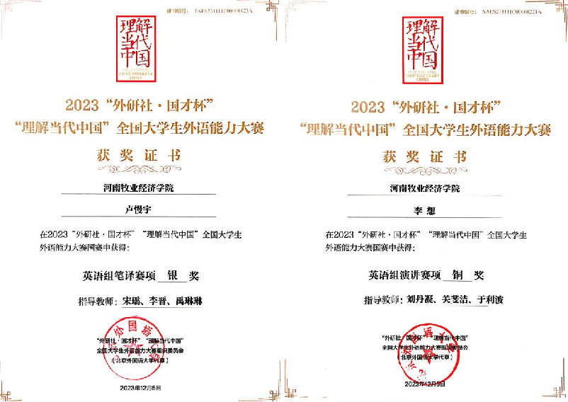 近日,2023“外研社·国才杯”“理解当代中国”全国大学生外语能力大赛全国总决赛在北京圆满落幕。我校外国语学院商务英语专业2021级学生卢慢宇荣获英语笔译大赛银奖,成绩位列河南省参赛选手第一名;商务英语专业2022级学生李想荣获英语演讲大赛铜奖。