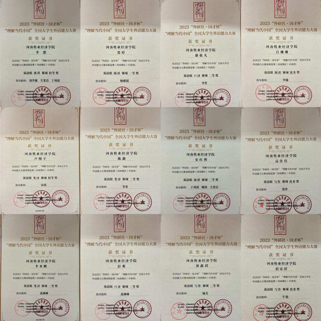 据悉,自赛事启动以来,我校外国语学院高度重视,在学工部、教务处的大力支持下举办了2023“外研社·国才杯”“理解当代中国”全国大学生外语能力大赛tyc8722太阳集团城校园选拔赛,各指导教师和学生通过赛前集中培训、强化训练的方式,为此次比赛做了充分的准备,我校选手在河南省省赛中荣获特等奖2项、一等奖2项,二等奖5项,优秀奖3项,获奖人数与层次均创历年新高。