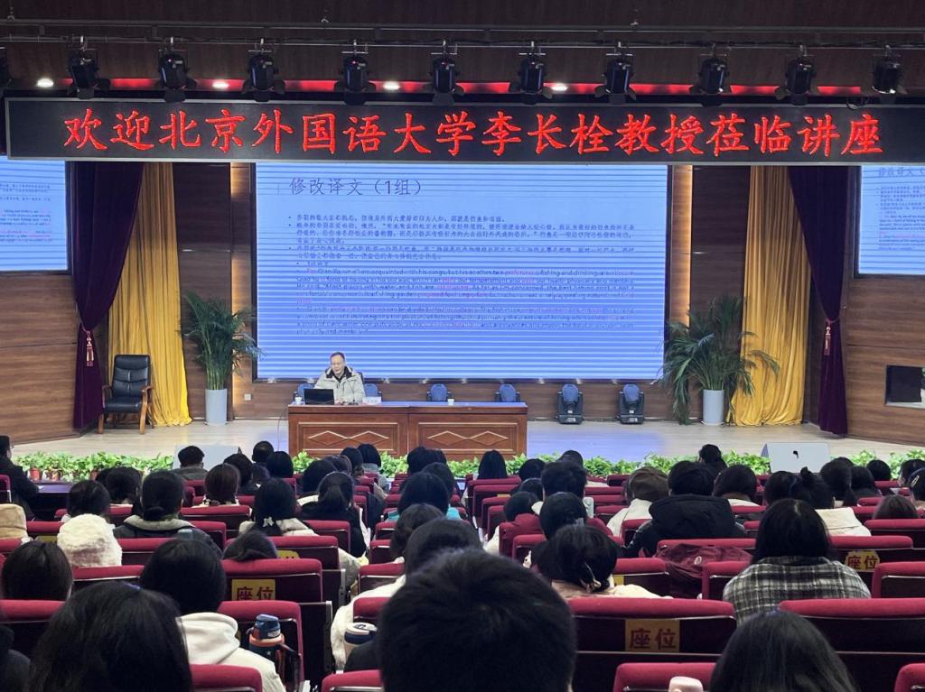 为助力外国语学院教师提高科研水平,帮助外语专业学生提升翻译能力,2023年12月29日上午,外国语学院邀请北京外国语大学高级翻译学院副院长李长栓教授在龙子湖校区1号教学楼合100报告厅举办了以《人工智能背景下的翻译实践》为主题的学术报告。外国语学院院长陈延潼、副院长闻华及该院师生代表参加报告会。报告会由闻华主持。
