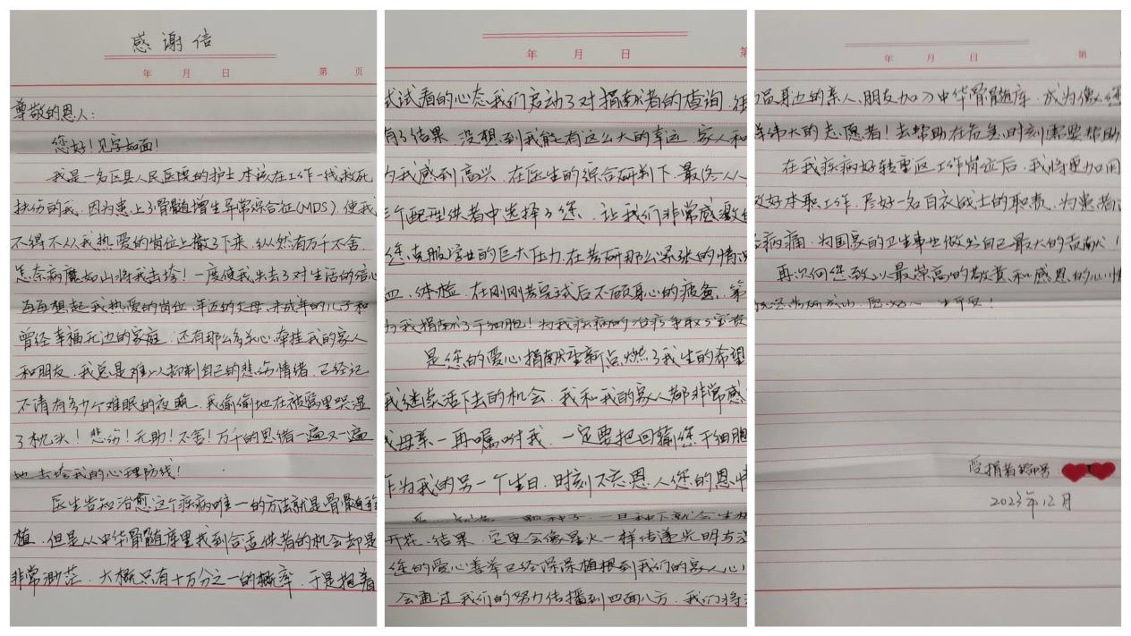 几天后,接到高分辨配型成功的王叶文,下了研究生考试考场,直奔“救人战场”——河南省人民医院注射动员剂、规律作息、锻炼身体,时刻为捐献造血干细胞准备着。12月29日上午,捐献正式开始,在同学和志愿者们的陪伴下,王叶文走进采样室,进行造血干细胞的采集,完成了造血干细胞的捐献,在2023年末为患者送去了2024年的第一份礼物,用爱点燃血液病患者的生命之光。“爱心就像一颗种子,生根、发芽、开花、结果,像星火一样传递光明与温暖!”,受捐的患者——某医院的一名医护工作者感激涕零,饱含深情手书一封感谢信寄于王叶文,字里行间不仅溢满感恩之情,还表示若能重返岗位,一定为救护更多的生命做出自己最大的贡献。