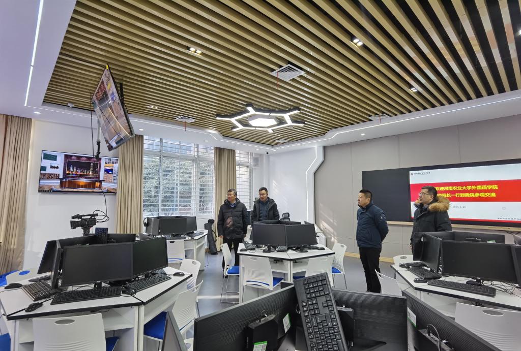 陈延潼对兄弟院校的到来表示热烈的欢迎,他介绍了学院的基本情况,重点分享了如何紧跟新文科建设要求,服务学校应用型办学定位,建设外语智慧教学实验室,打造教学练测评一体化的智慧外语教学生态的理念与具体做法。张俊杰介绍了河南农业大学外国语学院在语言实验室建设和智慧外语教学方面所开展的研究与实践。他希望进一步加强双方相关工作的经验交流与分享,助推农林类院校外语实践教学质量的提升。