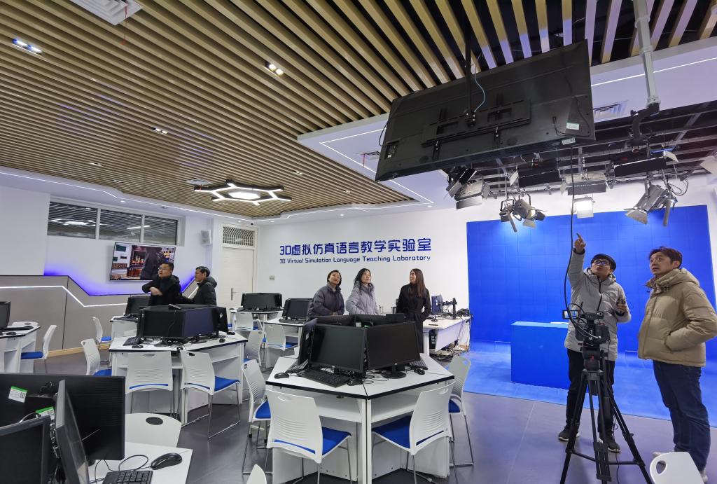 随后,张俊杰一行参观了我校虚拟仿真语言学习中心,在外语教学实验中心主任郑珏的演示下,实景体验了我校英语口语智慧实验室、3D虚拟仿真语言教学实验室的各项功能。并与我校相关教师围绕实验室建设、使用与维护以及依托智能云平台所取得的教育教学改革成果、存在问题以及解决途径等进行了深入地交流与探讨。