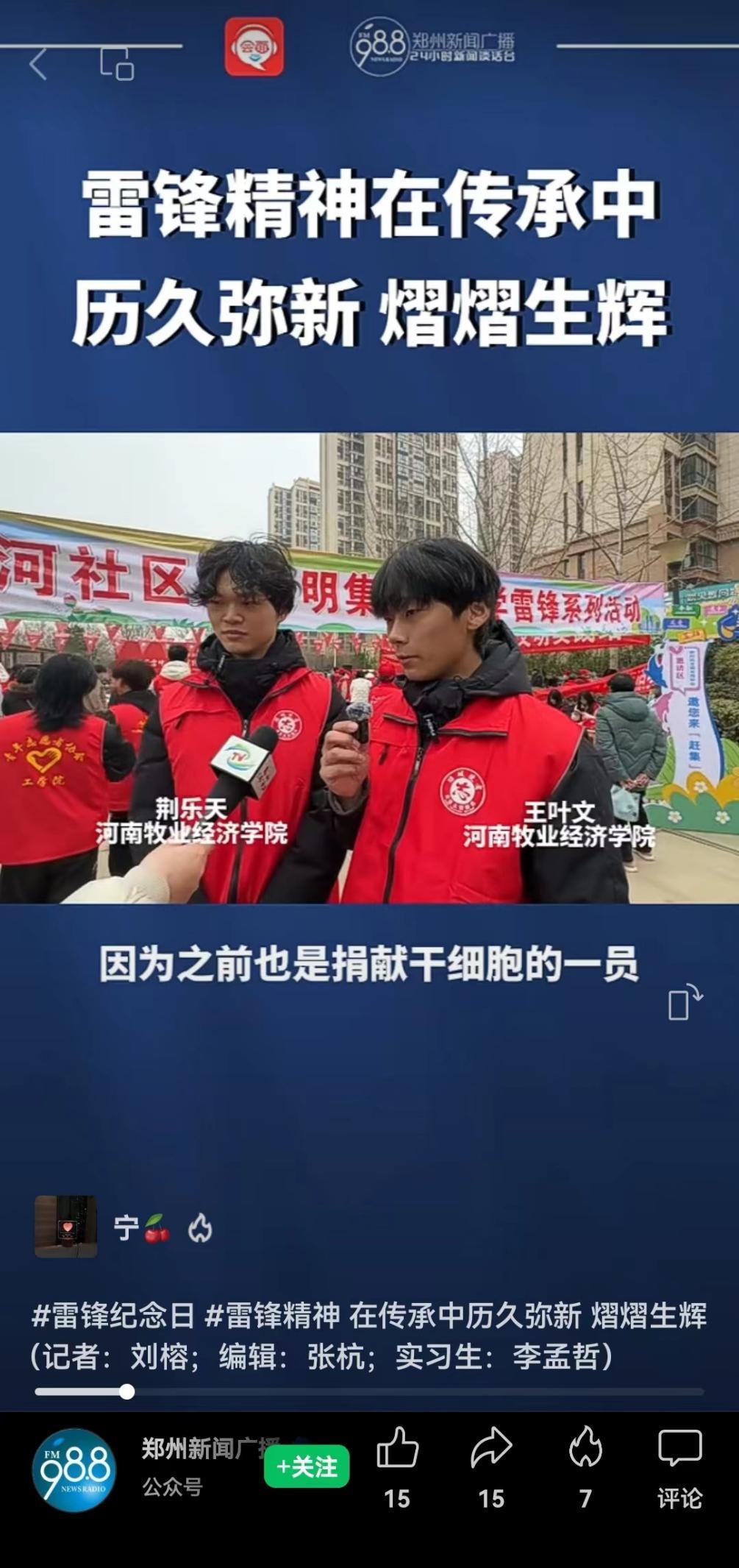 据悉,荆乐天、王叶文不仅捐献非血缘关系造血干细胞,还多次参加无偿献血及志愿服务活动,践行雷锋精神,传递人间大爱。活动结束后,郑州广播电视台对两位同学进行了采访,宣传我校青年学子乐于助人、勇于奉献的风采。(申作光 尚津 文/图)