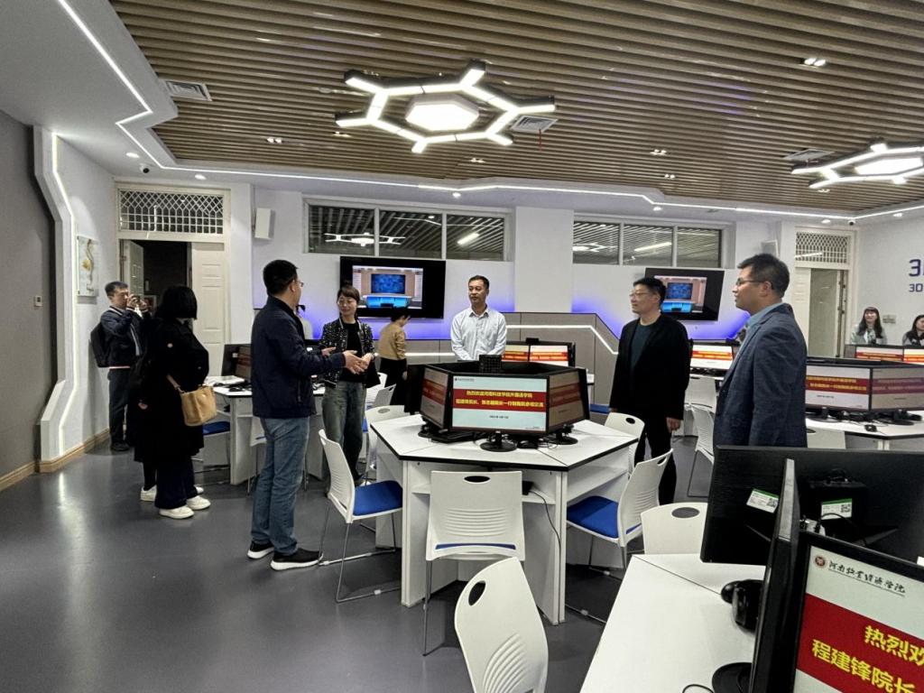 随后,程建锋、张志超一行参观了我校虚拟仿真语言学习中心,实景体验了英语口语智慧实验室、3D虚拟仿真语言教学实验室的各项功能。