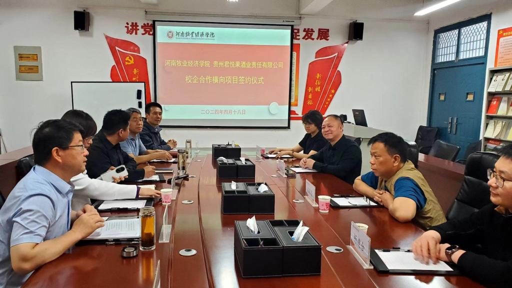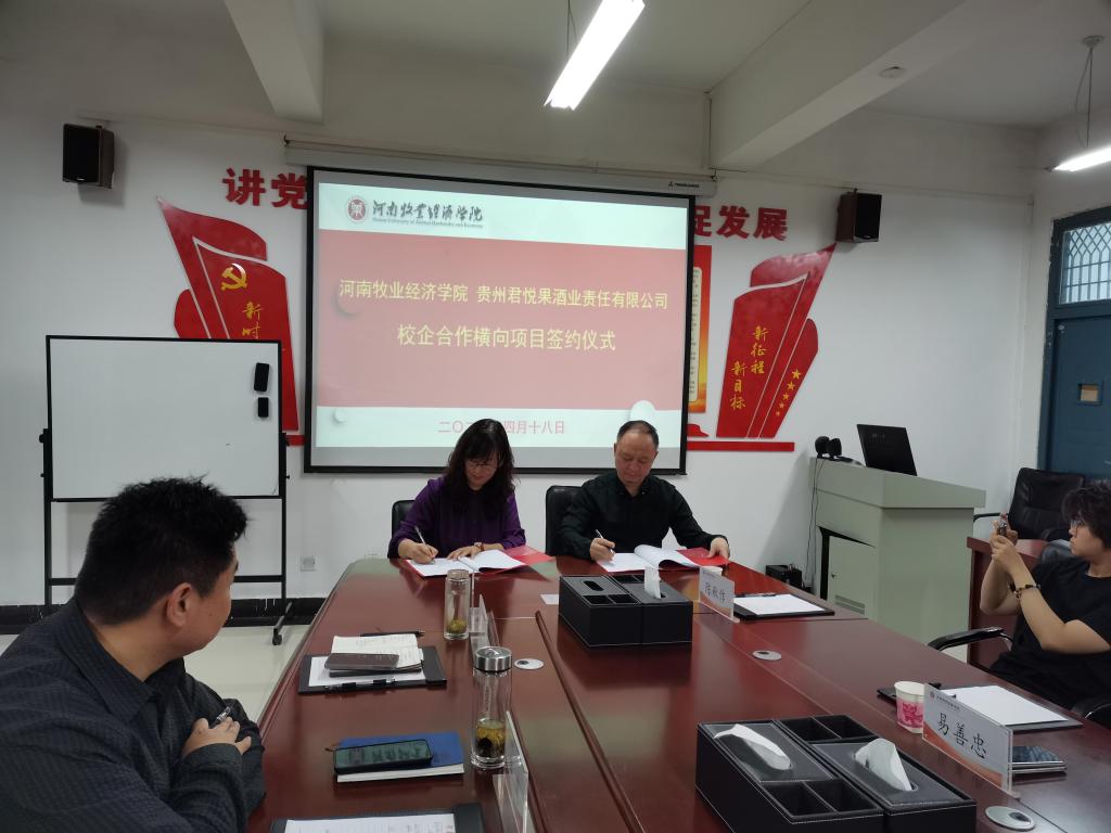 4月18日,我校与贵州君悦果酒业有限责任公司的横向项目“刺梨酒关键技术研发及产业化”签约仪式在学校龙子湖校区生工组团A426会议室举行。科学技术处处长潘春、食品与生物工程学院院长邹建及该院项目相关负责人、贵州君悦果酒业有限责任公司董事长王愿坚、总经理易善忠参加签约仪式。