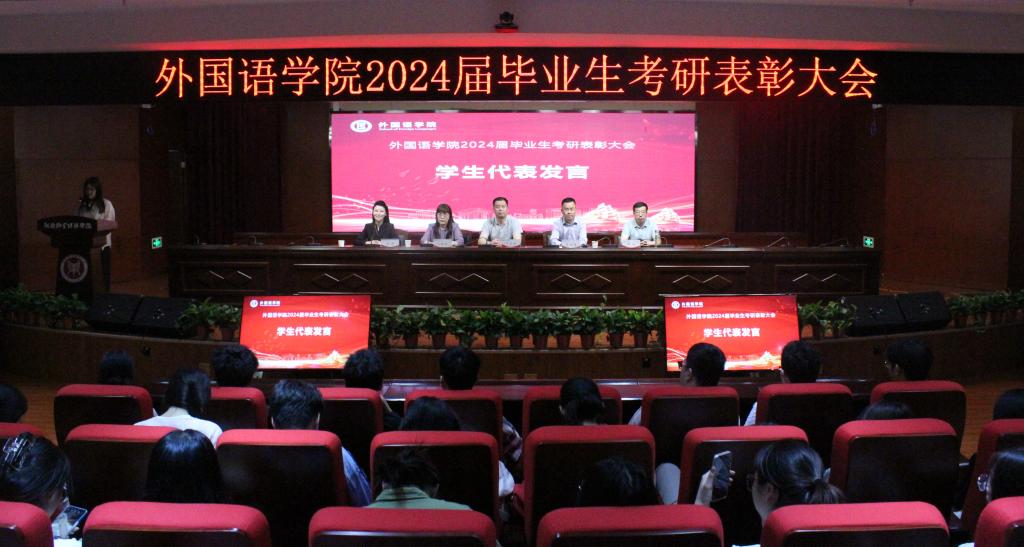 外国语学院2024届毕业生考研拟录取38人,其中考取“211”、“双一流”院校的学生有19人,考研升学率达15%,创该院历史新高。会上,学院领导共同为考研优秀指导教师及考研优秀学生颁发荣誉证书。宋嘉程等五位考研优秀学生代表分享了各自的备考心得。李晋等五位优秀的考研指导教师分享了考研组织动员、激励帮扶等方面经验,鼓励全体外语专业的学生,以奋斗为动力,追求自己的梦想。