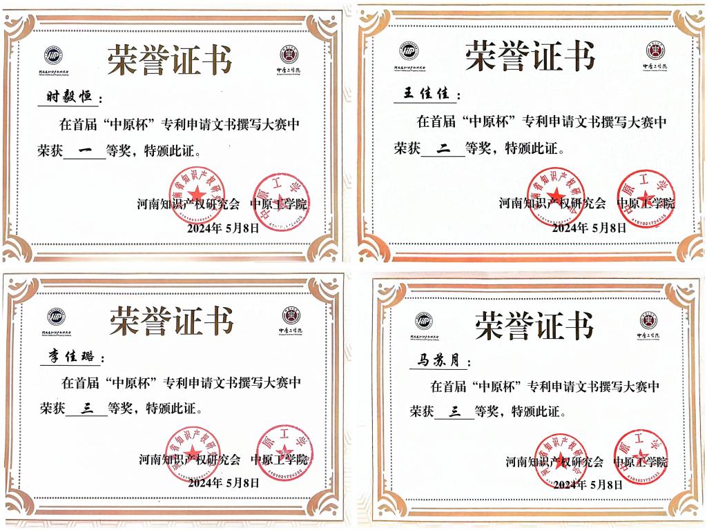 近日,首届“中原杯”专利申请文件撰写大赛在中原工学院龙湖校区圆满落幕。我校文法学院知识产权专业时毅恒同学喜获一等奖、王佳佳同学喜获二等奖、马苏月、李佳璐同学喜获三等奖。