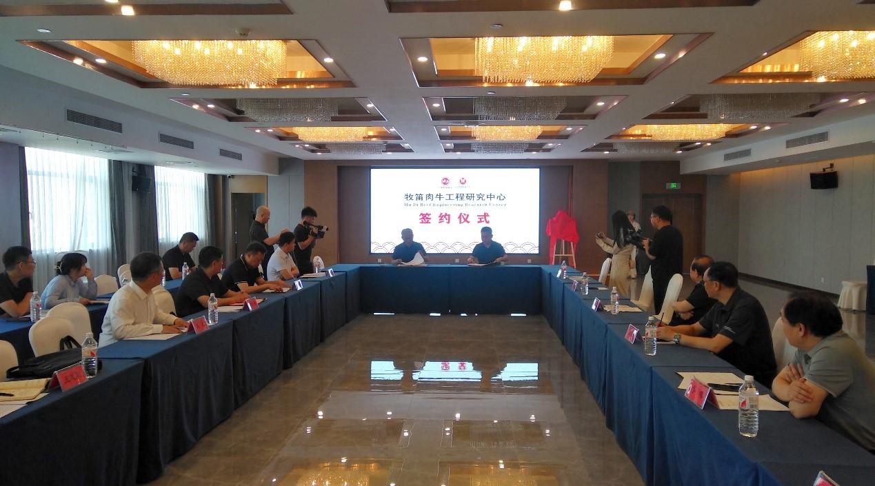 仪式上,邓红雨和王涛代表双方签约,张卫宪和王涛共同为牧笛肉牛工程研究中心揭牌。