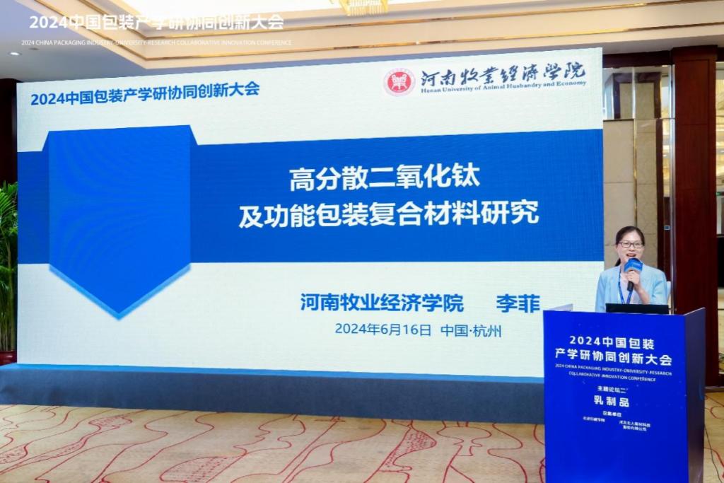 在乳制品分论坛上,包装与印刷工程学院教师李菲博士作了题为《高分散二氧化钛及功能包装复合材料研究》的报告。她主要分享了团队在高分散TiO2、生物质材料、功能性薄膜等方面的研究进展,并重点介绍了包装与印刷工程学院在抗菌、抗紫外线、光降解等多功能的复合软包装材料方面开展校企合作的情况。