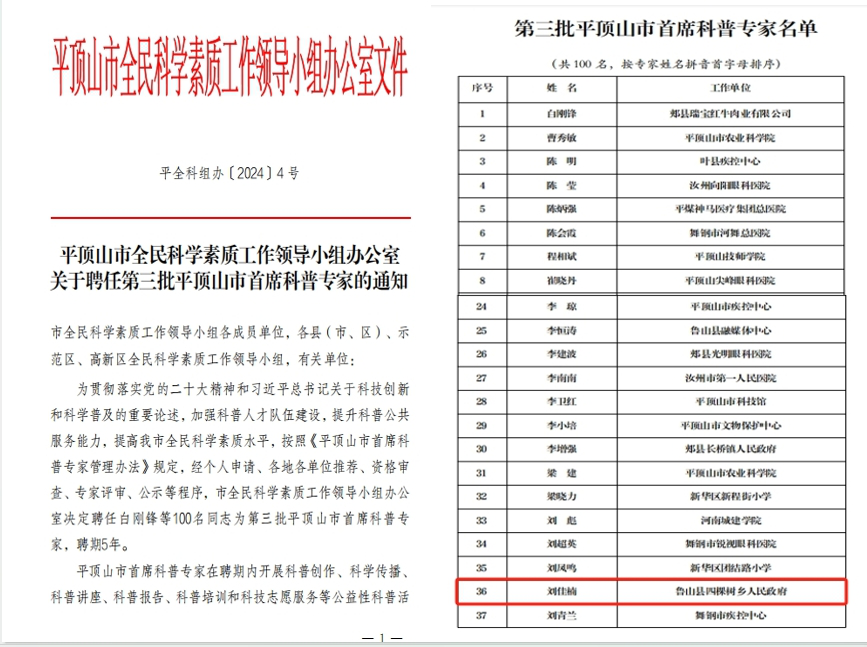 近日,平顶山市全民科学素质工作领导小组办公室公布了第三批平顶山市首席科普专家名单,经鲁山县科学技术协会和鲁山县四棵树乡政府联合推荐,我校经济与贸易学院团委书记刘佳楠获聘“平顶山市首席科普专家”。