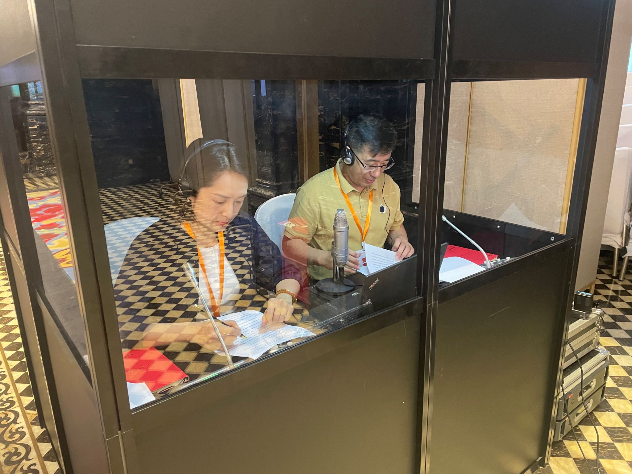 在接到合作企业工作邀请后,外国语学院高度重视,迅速组织专业团队,为本次大会的语言服务和英文直播制定实施方案,对相关会议的专业材料进行翻译。针对大会组织方要求对嘉宾现场讲座内容进行同声传译的要求,外国语学院克服各种客观条件的限制,提前整理嘉宾讲座内容的专业术语,认真梳理会议流程和设计衔接方案,充分发挥主观能动性和专业精神,最终顺利完成工作任务,受到了大会会务方和校企合作单位的高度赞扬。