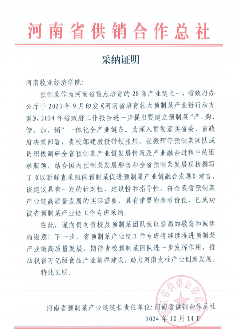 近日,学校预制菜科研团队围绕《河南省培育壮大预制菜产业链行动方案》,结合国内预制菜发展形势和我省预制菜发展现状,提出了关于《以新鲜直采短保预制菜促进预制菜产业链融合发展》的建言,该建言获得业内专家一致认可并被河南省预制菜产业链链主责任单位河南省供销合作总社采纳。