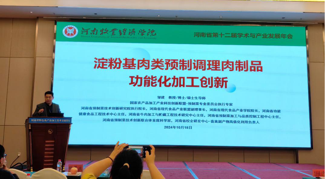 会上,邹建应邀作了题为《淀粉基肉类预制调理肉制品功能化加工创新》的主旨报告,提出在淀粉基肉类预制调理产品中存在的问题,针对现存问题构建了功能化加工技术体系,并实现该体系在淀粉基肉类预制调理食品中的产业化应用。