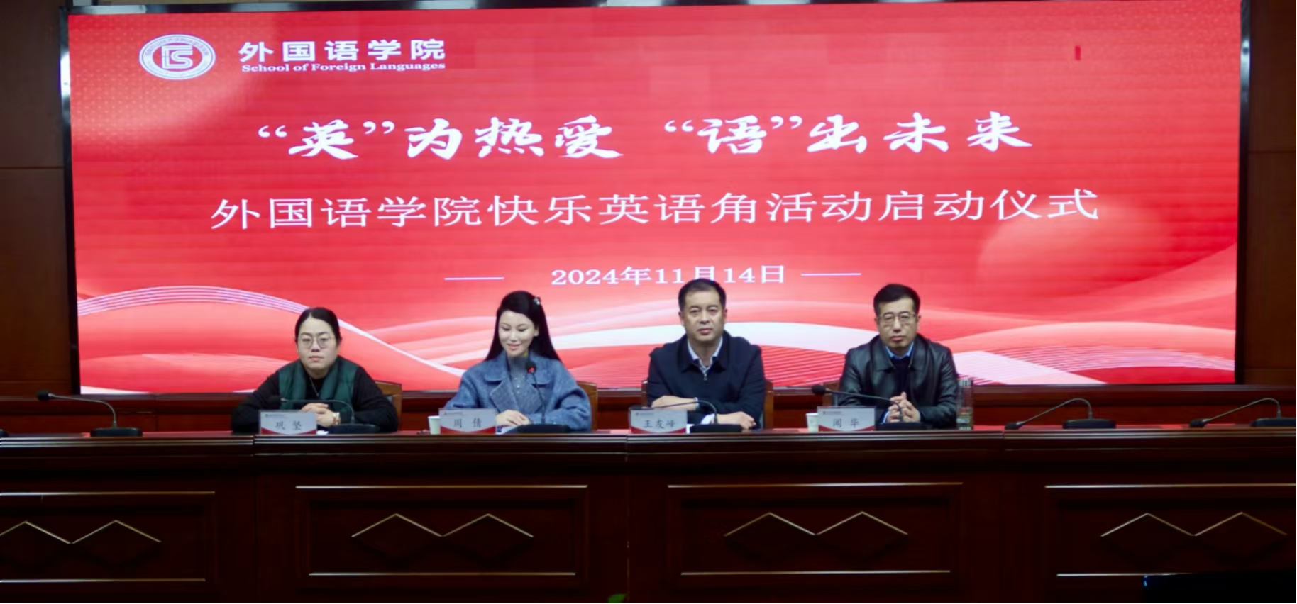为强化外国语学院学风建设,打造英语学习的校园文化品牌,11月14日,外国语学院在图书馆一楼报告厅举办“‘英’为热爱,‘语’出未来——快乐英语角”活动启动仪式。学院领导班子成员、师生代表参加启动仪式。仪式由外国语学院党委副书记周倩主持。