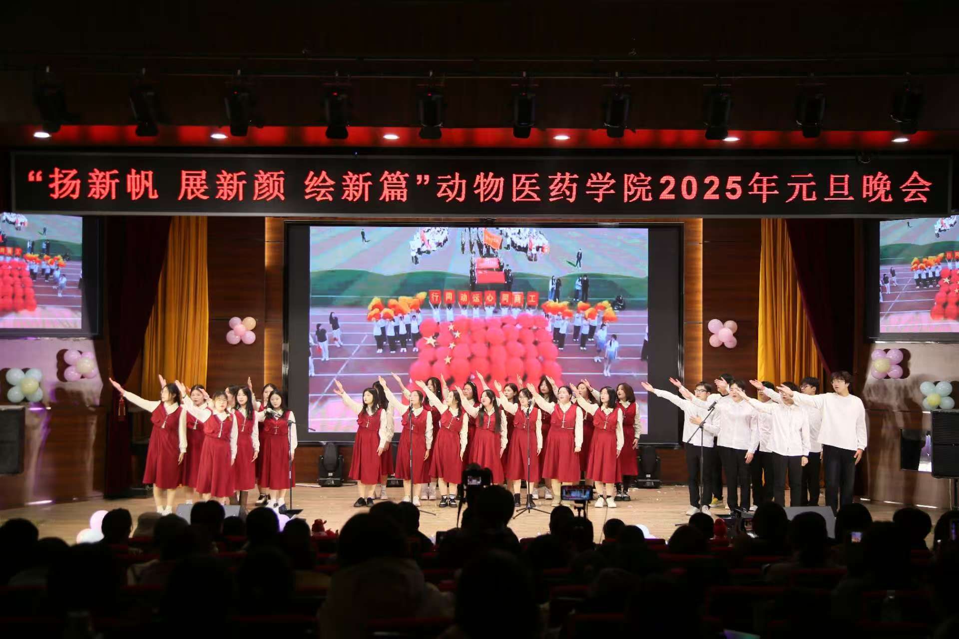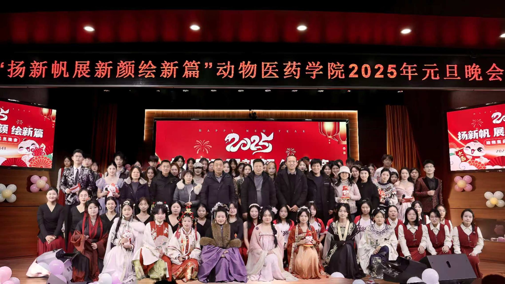祥龙摆尾辞旧岁,灵蛇纳福迎春来。为庆贺元旦佳节,12月25日晚上,动物医药学院在尚严楼合100报告厅举办“扬新帆 展新颜 绘新篇”2025年元旦联欢晚会,学院领导班子成员及300余名师生欢聚一堂,共享视觉盛宴。